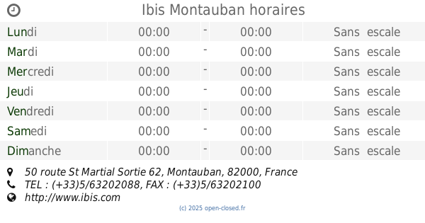 Add it to your website, your phone or even your desktop - opening times, phone numbers and the road to Store of the Ibis Dans Montauban, 50 route St Martial Sortie 62.